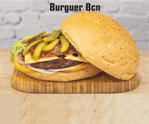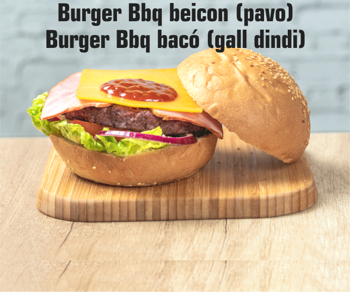 200 gr. ternera, cogollos, tomate, cebolla de Figueres, queso cheddar, beicon (pavo) y salsa bbq.