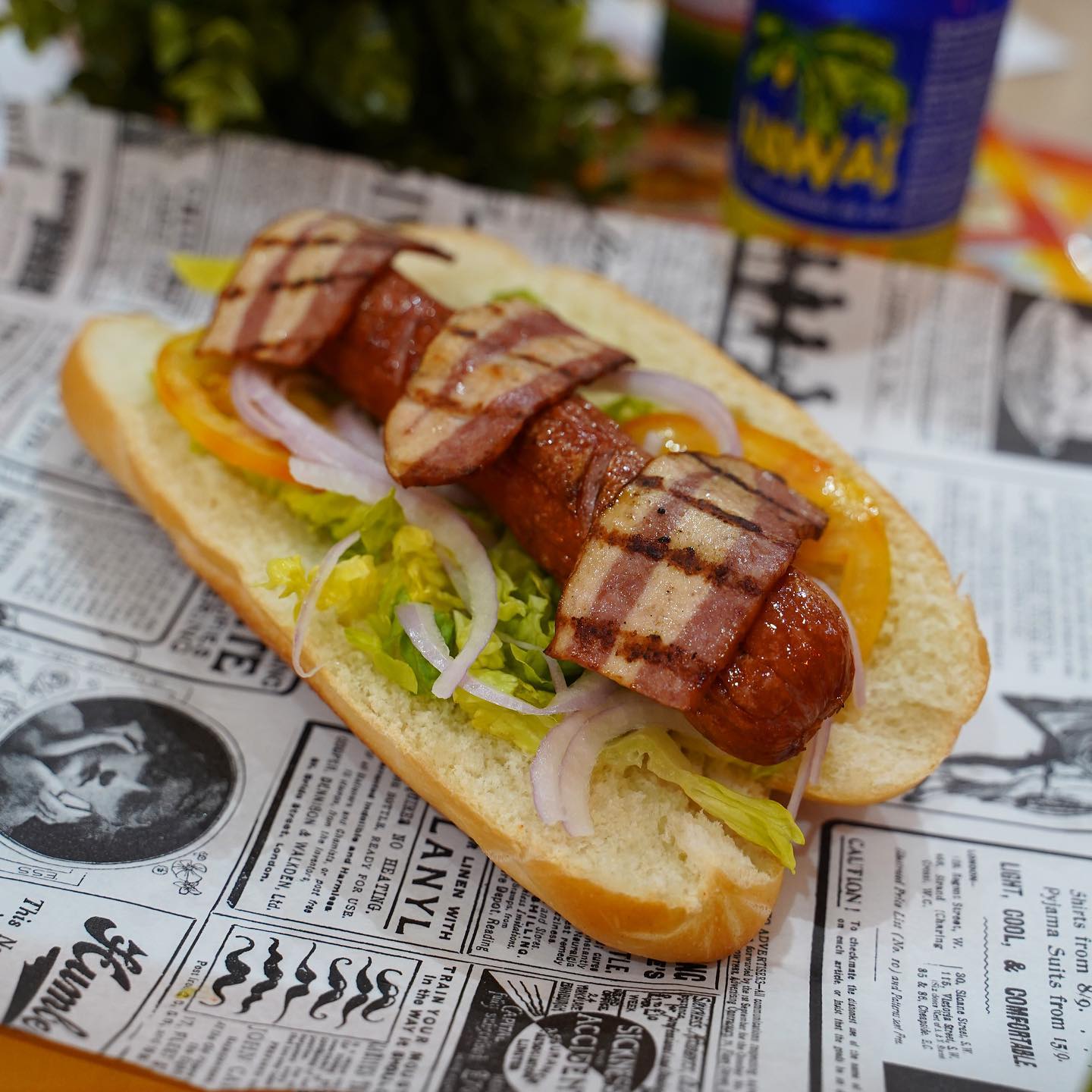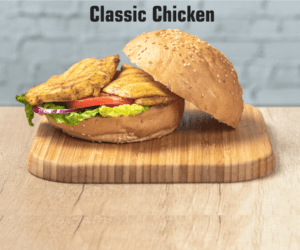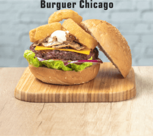 Pollo marinado a la parrilla, cogollos, tomate, cebolla de Figueres, queso provolone, cebolla caramelizada, champinones, guacamole y salsa burger world.