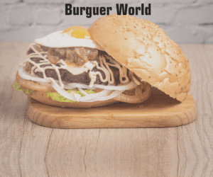 200 gr. ternera, cogollos, tomate, cebolla de Figueres, queso cheddar, champinones, cebolla caramelizada, aros de cebolla y salsa burger world.